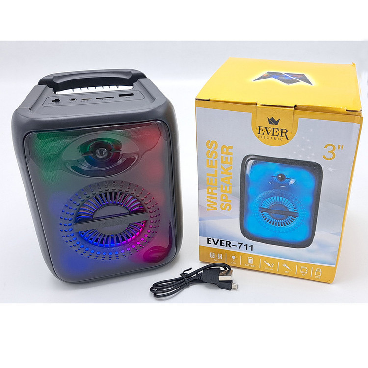 اسپیکر بلوتوثی قابل حمل مدل EVER-711 ، یکی از محصولات شرکت EVER است که با توجه به ابعاد و وزن نسبتا مناسب خود میتواند در هر جایی لذت گوش دادن به موسیقی را برای کاربران فراهم کند. این اسپیکر میزبان درایو آن به همراه نورپردازی RGB سری جدید است تا این اسپیکر بتواند صدا را به صورت مستقیم و با بیشترین کیفیت به گوش کاربران برساند و جلوههای بصری بسیار زیبایی به آنها ارائه کند. پورتهای اتصال این اسپیکر در قسمت بالایی آن قرار دارند و به هیچ عنوان زیبایی قسمت جلویی این محصول را دچار اختلال نمیکنند. کلیدهای کنترل موسیقی و صدا هم در قسمت پشت اسپیکر بلوتوثی EVER-711 قرار دارند و دسترسی به آنها کار دشواری به نظر نمیرسد. درایو اصلی EVER-711 قابلیت ارائه توان خروجی حداکثر 15 وات را در بازه فرکانسی 100 هرتز الی 20 کیلوهرتز ارائه میکند تا بلندی و شفافیت صدای نسبتا مناسبی را هنگام گوش دادن به موسیقی از این اسپیکر شاهد باشیم. اتصالات اسپیکر به حافظه جانبی و دستگاهها توسط پورتهای USB، شیار کارت حافظه Micro-SD و درگاه 3٫5 میلیمتری AUX انجام میشود. امکان اتصال بدون سیم نیز توسط بلوتوث داخلی EVER-711 وجود دارد و کاربران به سادگی میتوانند تلفن همراه، تبلت و دیگر دستگاههای بلوتوثی خود را به سادگی با این اسپیکر همگامسازی کنند. از دیگر قابلیتهای این اسپیکر میتوان به امکان استفاده از آن به عنوان استند تلفن همراه اشاره کرد که قابلیت منحصربهفردی برای یک اسپیکر شمرده میشود. تامین انرژی این اسپیکر نیز برعهده باتری 1200 میلیآمپر ساعتی است که از شارژدهی مناسبی نسبت به بلندی صدا برخوردار است.سایز این اسپیکر 3 اینچ با ابعاد 17x13x12 سانتی متر می باشد که آن را برای حمل ، آسان تر کرده است .