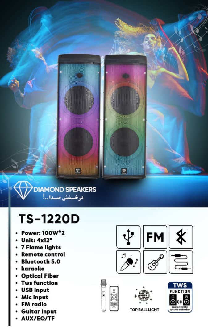 دو ساپ ۱۲ اینچی ۲تیوتر و ۲ میدرنج حذف صدای خواننده ضبط صدا روی فلش پنل بسیار زیبا و حرفهای وضوح صدای فوق العاده رقص نور جدید و زیبا و سقفی ورودی مموری کارت-فلش- AUX میکروفون حرفه ای بیسیم وصل ب تلوزیون و تمام آلات موسیقی وصل ب گیتار ورودی کابل اپتیکال دارای رادیو FM