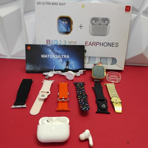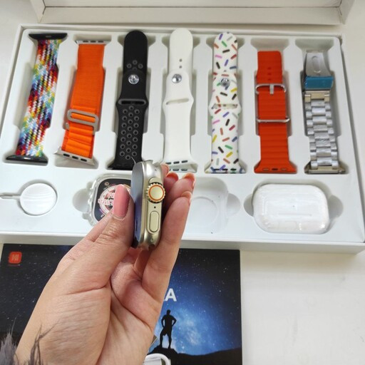 اقلام همراه: محافظ سیلیکونی ساعت ، 7 ست کامل بند( یک عدد فلزی، 4 عدد سیلیکونی، 2 عدد پارچه ای) ، ایرپاد پرو2 ، وایرلس شارژ ساعت